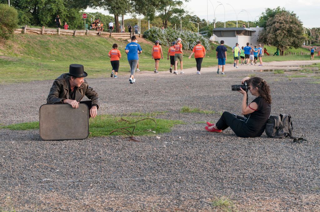 Uma produção de set conta com muitas variáveis, e seguimos um cronograma que pode ser alterado a qualquer momento. Por isso, é um jogo de cintura e tanto, o que a produção tem de fazer; e por isso também não podíamos prever com precisão qual seria a última imagem a ser feita. E, por capricho do destino, estávamos nós lá, envolvidos com nosso último personagem a ser fotografado: o Arlequim! Aquele que é farsante mas também é sedutor, amante da Colombina, comediante, saltimbanco, polichinelo, bufão, cata-vento, gaiato, debochado… e um símbolo do carnaval. Acabamos em pleno parque de diversões, usando os brinquedos destinados as crianças ( e aquele adulto que ainda traz consigo a criança que foi ). A aventura era estar ali, no parquinho da redenção, o zapt zum com o Edu K. Ele, naquele figurino surreal, de losangos brancos e pretos, que se misturavam com a paisagem em movimento. Estávamos girando no jatinho, num dia de semana qualquer, e aquilo era o nosso trabalho. E depois, descemos para o carrossel, e continuamos a girar, até que chegamos no trenzinho, e ali, terminamos uma jornada. Durante todo o processo, buscamos uma linguagem de pormenores, nuances mágicas e poéticas pouco percebidas em nossas rotinas. Queríamos sempre encontrar o cenário certo para cada personagem. E no Desordem, esse cenário foi a própria cidade. O Arlequim desloca-se por essa cidade fazendo teatro, nunca num emprego fixo; quer convencer a todos que é um ser ingênuo, simplesmente para não carregar o peso da responsabilidade. Faz acrobacias incríveis, e foge do palco dançando…