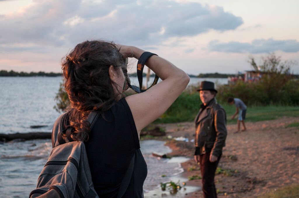Estávamos literalmente no meio da avenida Borges de Medeiros, e parecia que o perigo vinha mais de uma ideia que tínhamos sobre a imagem (a foto do poema Cúpula Nuclear) do que o real, acontecendo ali. Segurei a mochila da Fernanda, que estava nas suas costas, para guiá-la de alguma maneira, quando o pessoal da equipe gritava que um automóvel ou algum ônibus se aproximava. Alguém já disse que os fotógrafos quando estão com o olho na câmera ficam cegos para o resto do mundo? Porque ela captava as imagens da “mesa de chá” no meio da rua, só aquilo existia. No centro da avenida, na única parte onde os veículos não podiam chegar até os atores e seus personagens, parecia que víamos uma outra dimensão se estabelecendo ali, na nossa frente, fictícia. E já conseguíamos ler o livro, antes dele estar pronto, antes da gráfica, antes da publicação. Aquilo ali também foi o livro. É o livro. A produção daquele momento, cada detalhe feito por todos nós. Os atores não se abalavam com o transtorno que é, ônibus e automóveis em velocidade, zunindo pra lá e pra cá. Tudo se movia entorno da cena, porém ela parecia estática; e ficou, depois, na fotografia ela se eternizou. A mesa de chá era surreal, e os transeuntes sentiam esse impacto em suas rotinas, eles interagiam com a aquela surpresa ilusionista, que não era teatro e não era cinema, e não era realidade tão pouco; então paravam, e perguntavam o que aquilo significava. Foi aí que começamos a entender: estamos fazendo algo diferente, pois temos a poesia e a fotografia sendo captadas juntas. As palavras vinham com força e pairavam no ar; os versos que inspiraram a cena, circundavam todos nós, mesmo que inconscientemente. A arte é assim, ela acontece sem a nossa permissão; no entanto, somos os agentes propulsores dela.